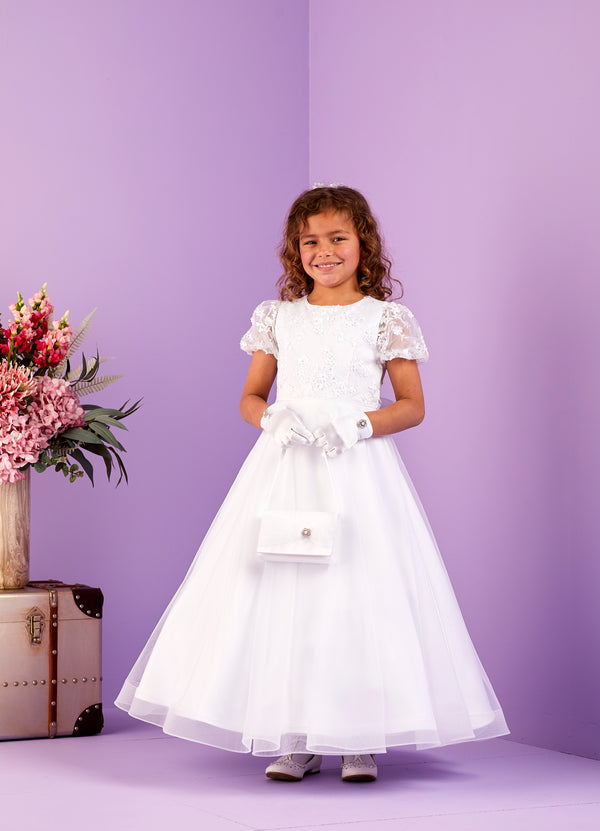 The Ayda dress is a breathtaking ankle-length Holy Communion gown. It features a bodice and sleeves of 3D laser-cut embroidered lace, adorned with delicate silver sequins that add a gentle sparkle.
