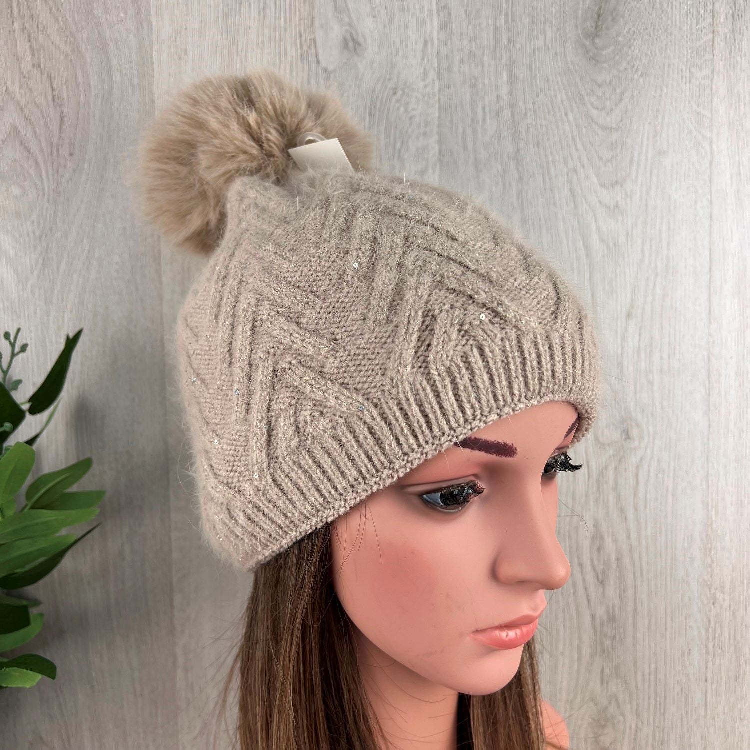 Beige Pom-Pom Knitted Neutral Hat With Glitter Fleck