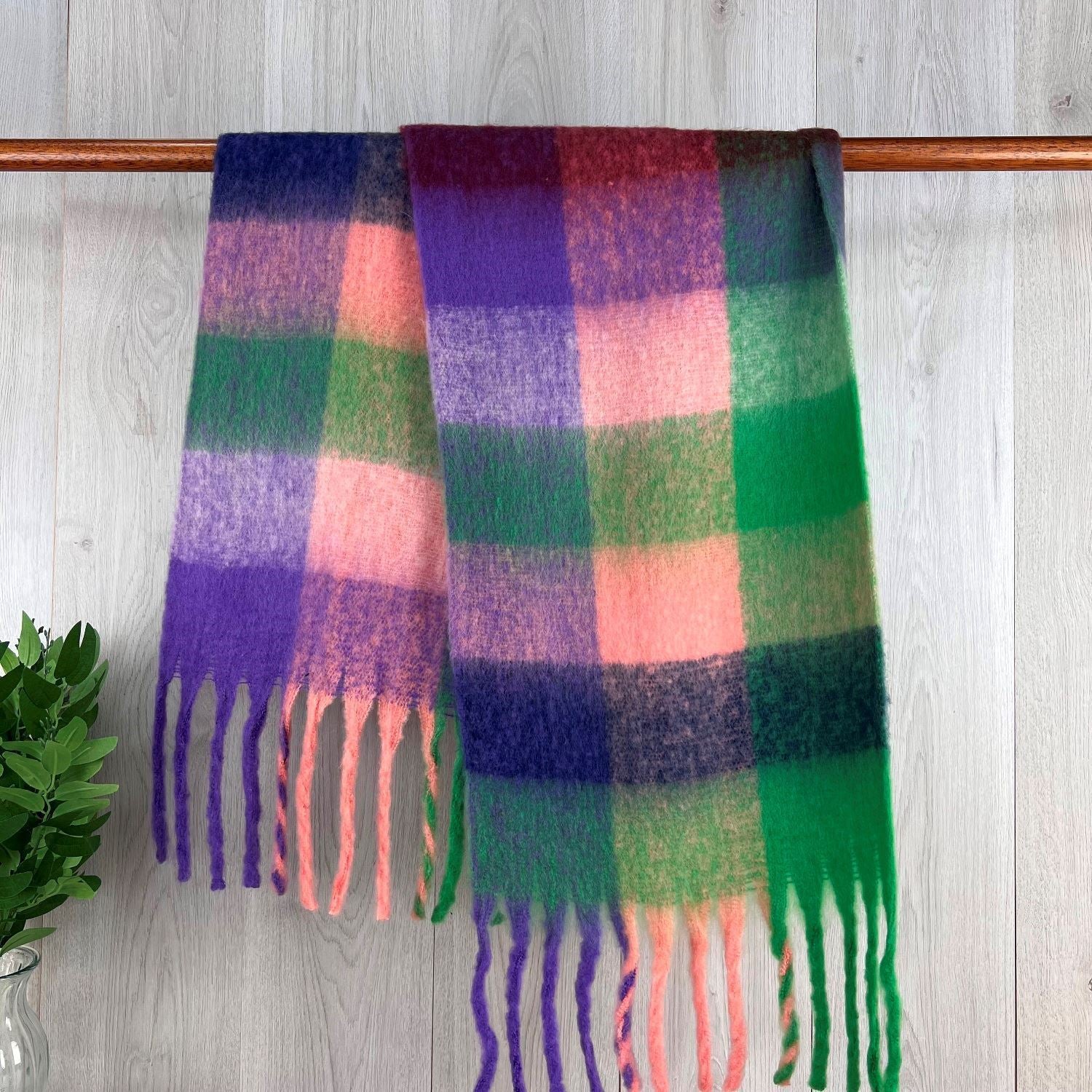Green and Pink Chunky Winter Checked Scarf With Long Fringe